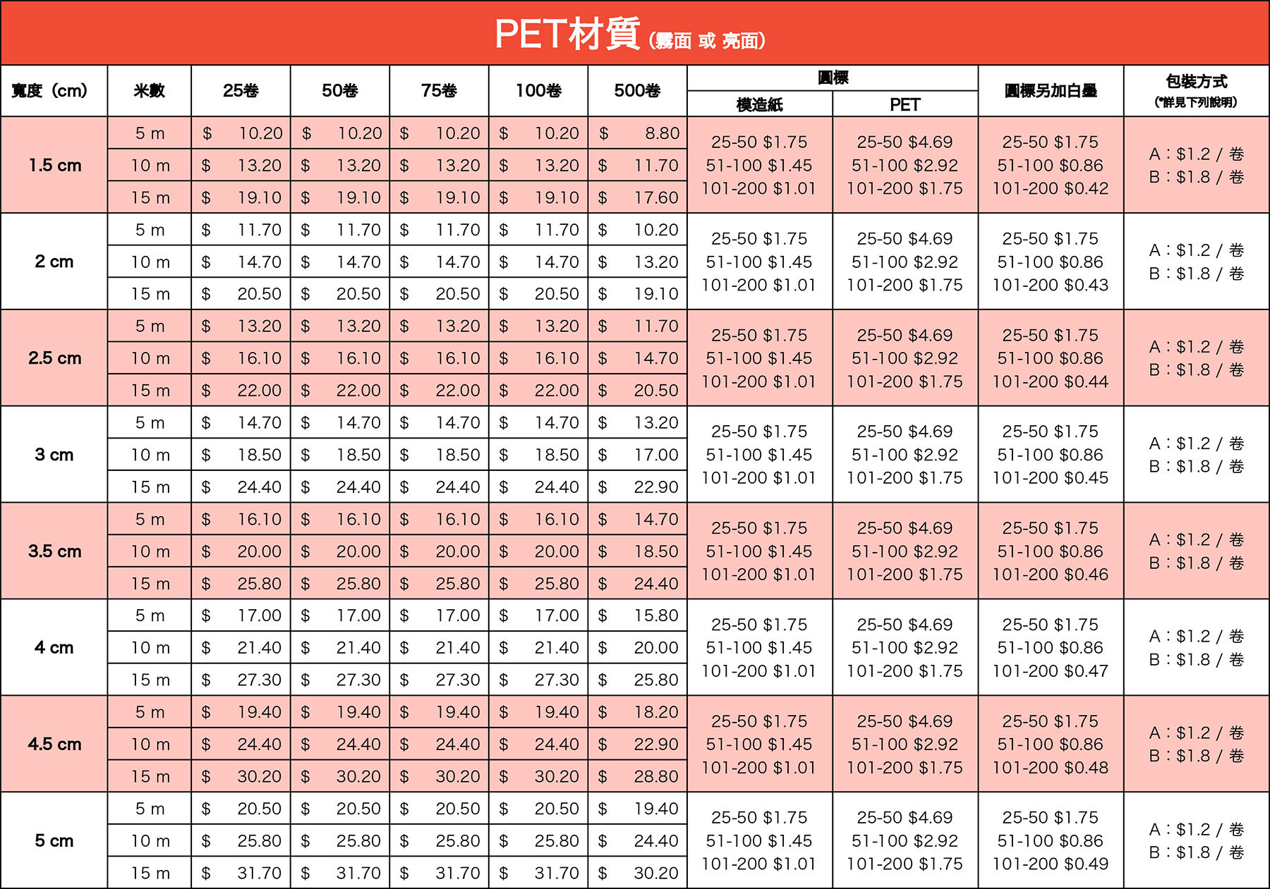 .圓標&背標、包裝材料均需另外收費,詳見下列報價表